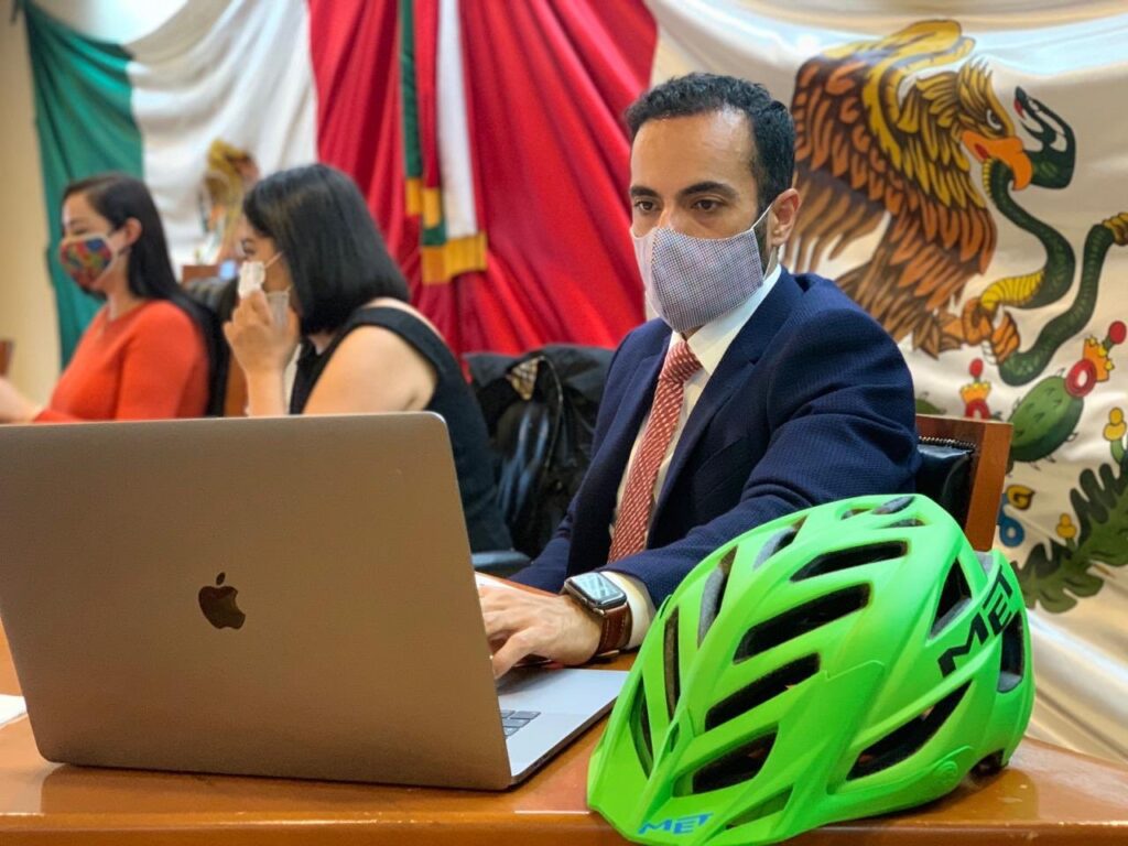 Naucalpan, México a 25 de Noviembre de 2020.- El Primer Síndico de Naucalpan, Maximiliano Alexánder Rábago, planteó la implementación de un programa especial para la construcción de ciclo vías emergentes y estacionamientos para bicicletas en los espacios públicos dependientes del Gobierno municipal, como parte de la política integral de movilidad y seguridad vial del municipio Naucalpense.